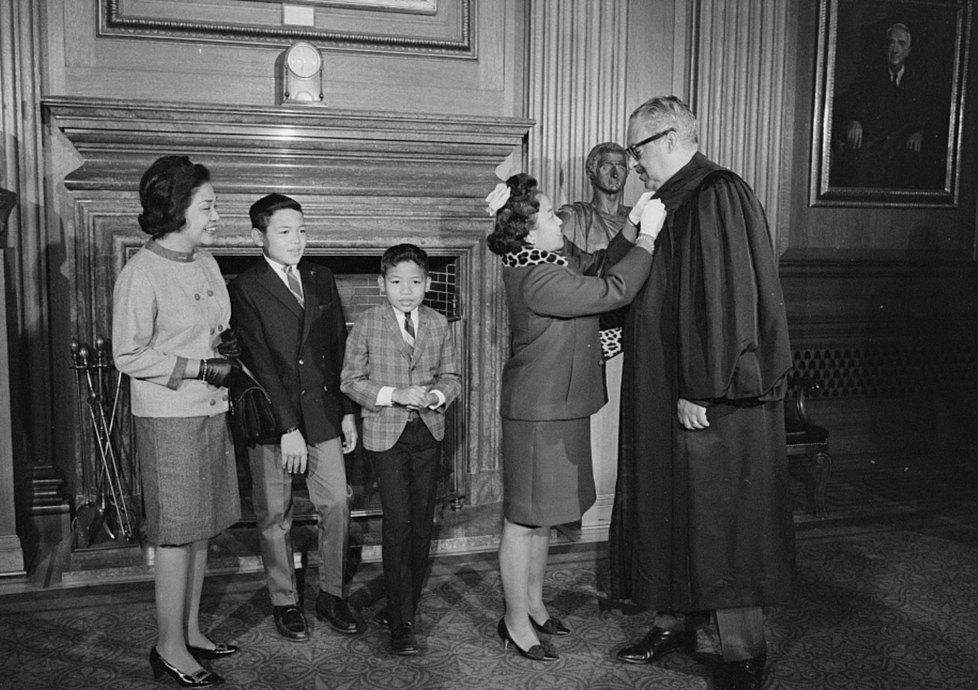 Thurgood Marshall, Associate Justice of the Supreme Court, assisted with his robes by his wife Cecilia (Suyat) Marshall, with his family (left to right) sister-in-law Sally Aroba and sons Thurgood Jr. and John